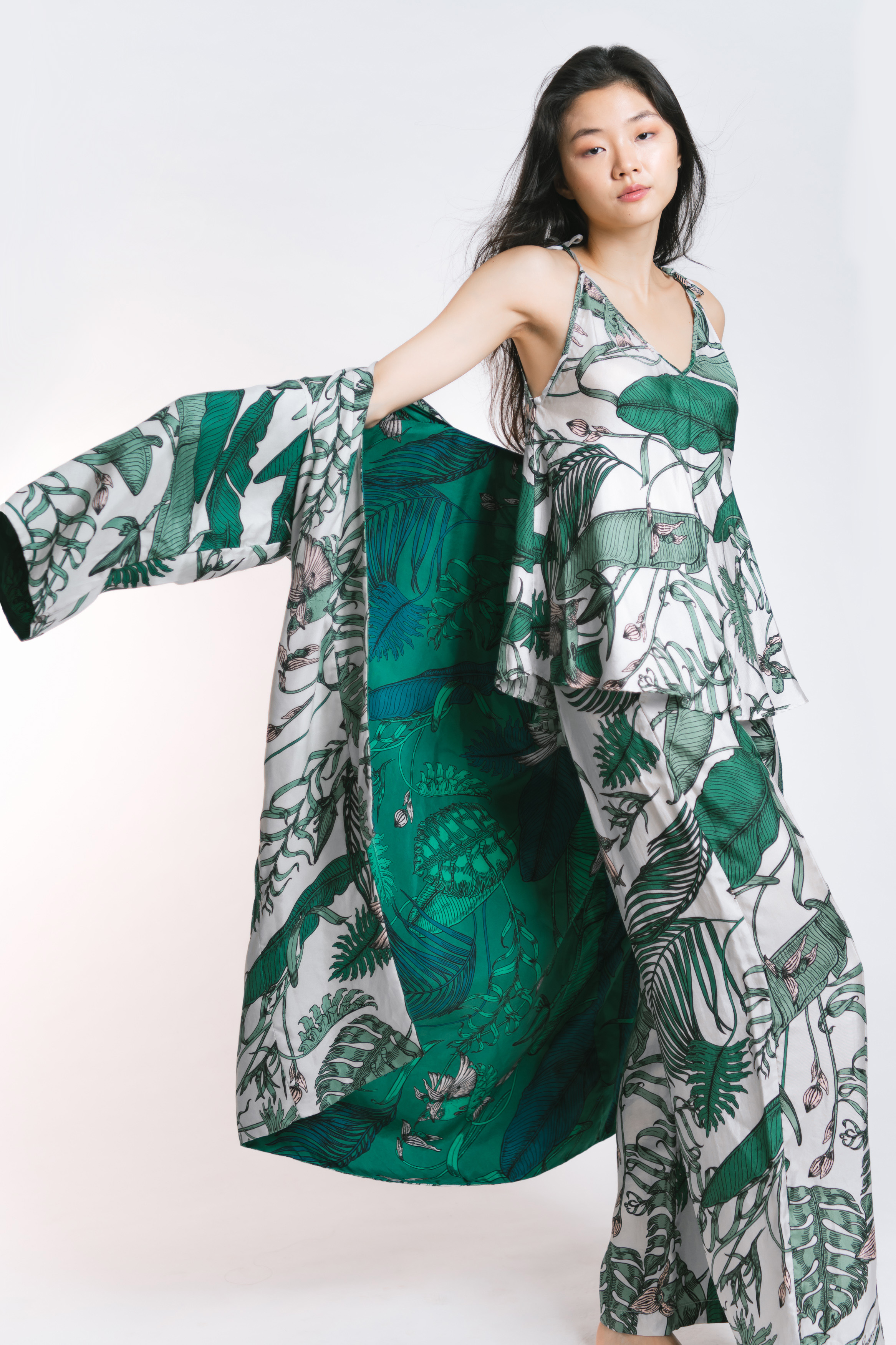 Tropical Foliage in Jade & Emerald - Reversible Kimono & Silk Set